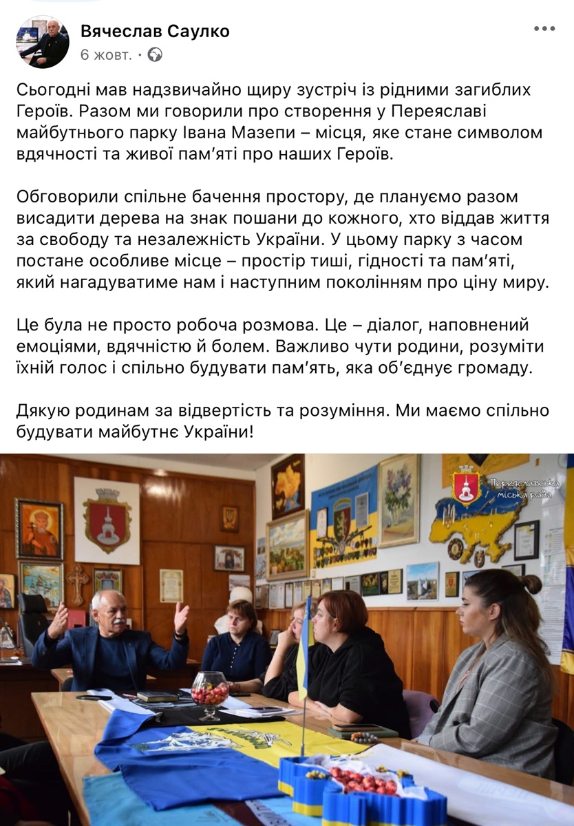Опісля до мера звернулася ініціативна група родин загиблих Героїв, які на прийомі 6 жовтня подали прохання долучитися до висадки кленів у пам'ять про Захисників. Вячеслав Саулко на словах підтримав таке клопотання. Говорили про те, щоб ряд кленів, які позначені на візуальному плані парку, назвати Алеєю Героїв.