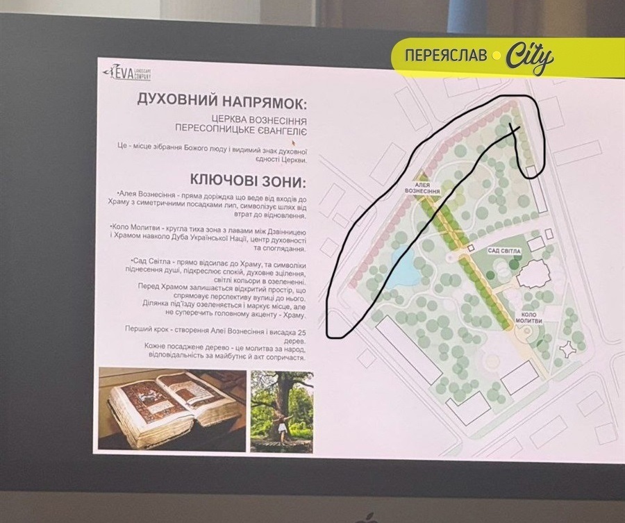 Мер Переяслава представив депутатам план майбутнього парку на сесії 1 жовтня 2025 р. Блакитним на фото виділене місце, де планується, що буде "сад Світла", а помаранчевим – алея Вознесіння