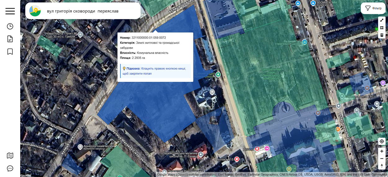 Мер Переяслава представив депутатам план майбутнього парку на сесії 1 жовтня 2025 р. Зеленим кольором на фото виділена територія, де планується "Козацький гай", а жовтим – "сенсорний сад"