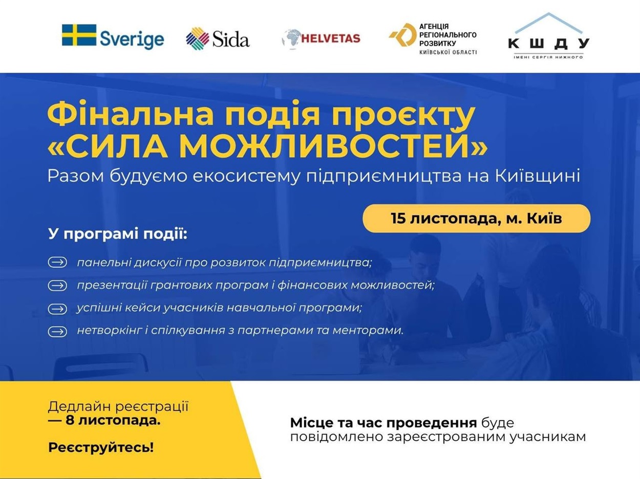 На Київщині добігає завершення бізнес-навчання «Сила можливостей», спрямоване на розвиток підприємництва та економічної спроможності громад області. Протягом кількох місяців учасники та учасниці проєкту проходили навчання, консультування та практичні модулі, які допомагали розвивати бізнес-ідеї, формувати стійкі бізнес-моделі й посилювати власну роль у відбудові локальної економіки.