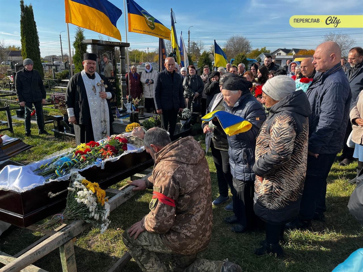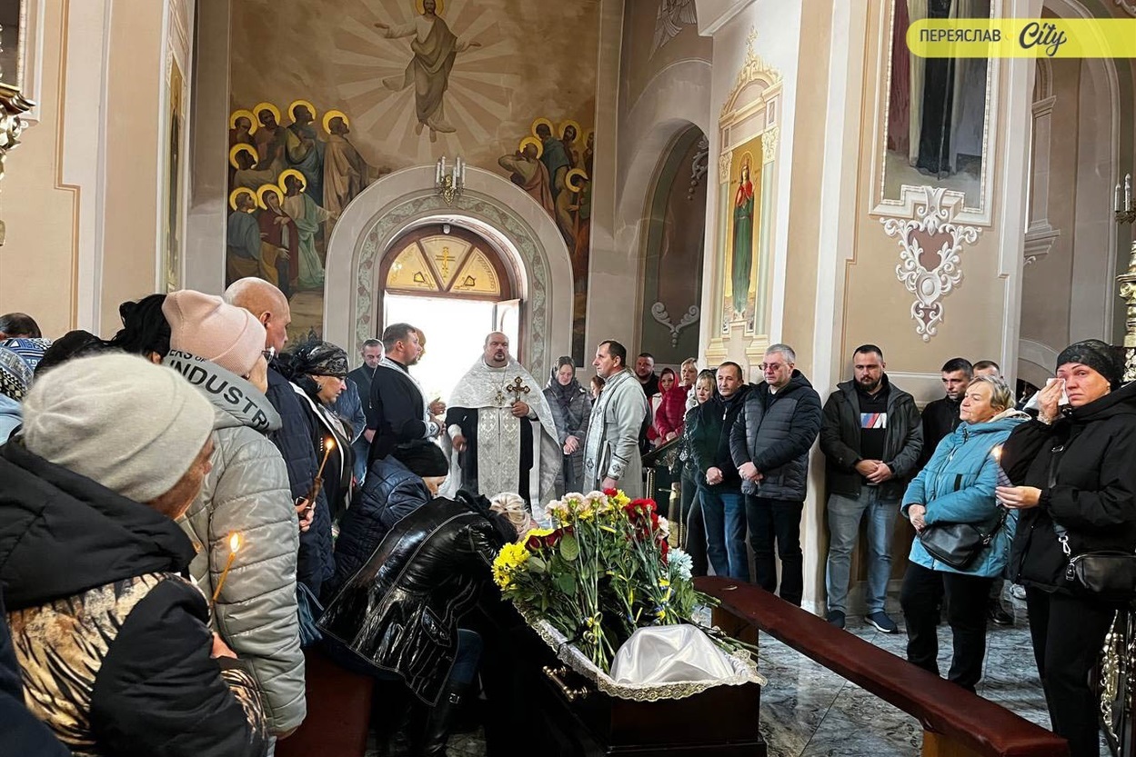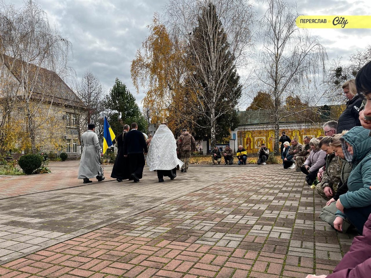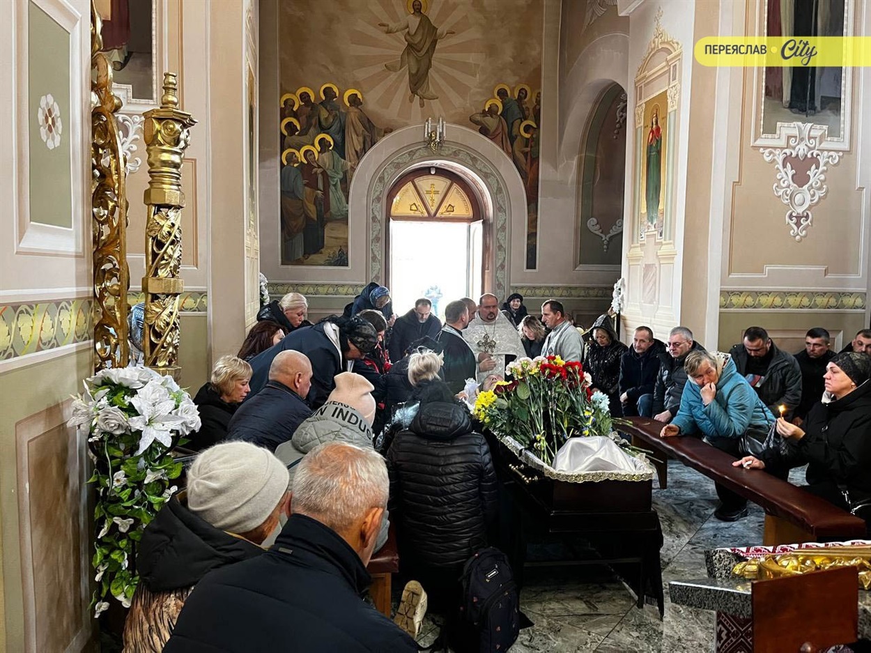 Коли військові з Добровольчого формування територіальної оборони Переяславської громади переносили домовину з катафалка до церкви, присутні схилили голови та опустилися на коліно. У повітрі панувала тиша та скорбота.