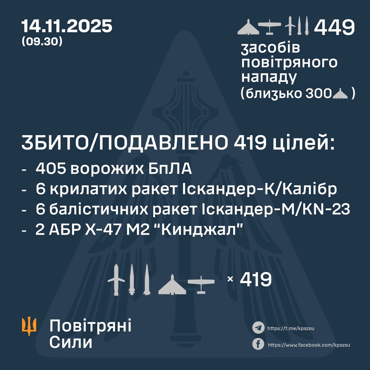 За даними Командування Повітряних сил ЗСУ, станом на 9:50 у ніч на 14 листопада (з 18:00 13 листопада) росія завдала комбінованого удару по об’єктах критичної інфраструктури України із застосуванням ударних БпЛА та ракет повітряного, наземного і морського базування.