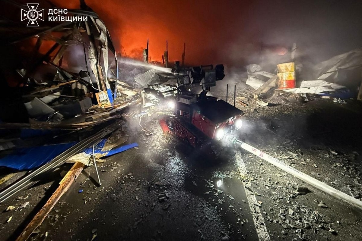 ДСНС Київщини повідомила, що в Нових Петрівцях уламки збитого дрона спричинили масштабну пожежу складської будівлі площею 5500 кв. м. Також пошкоджено житлові будинки та вантажні автомобілі.
