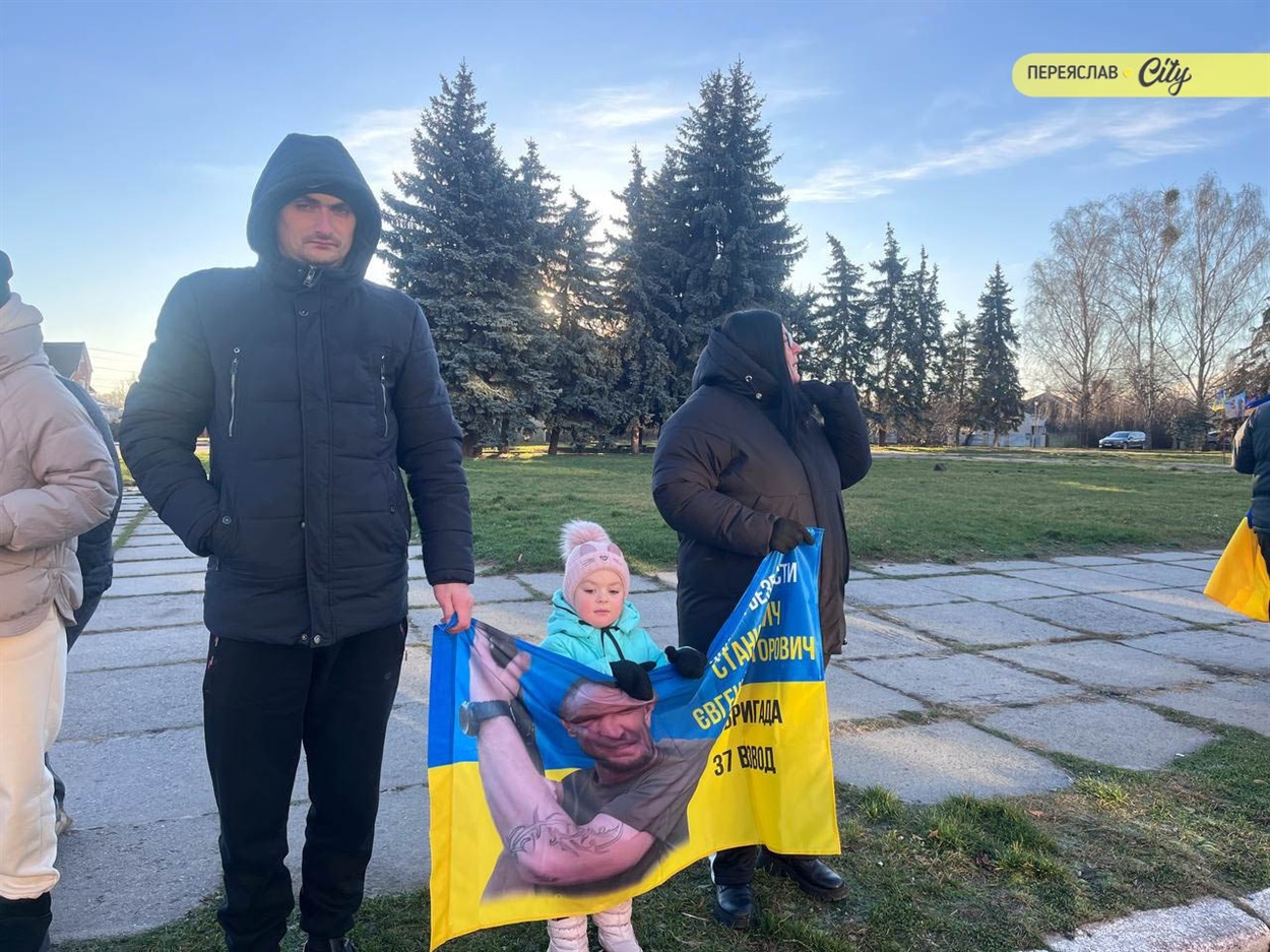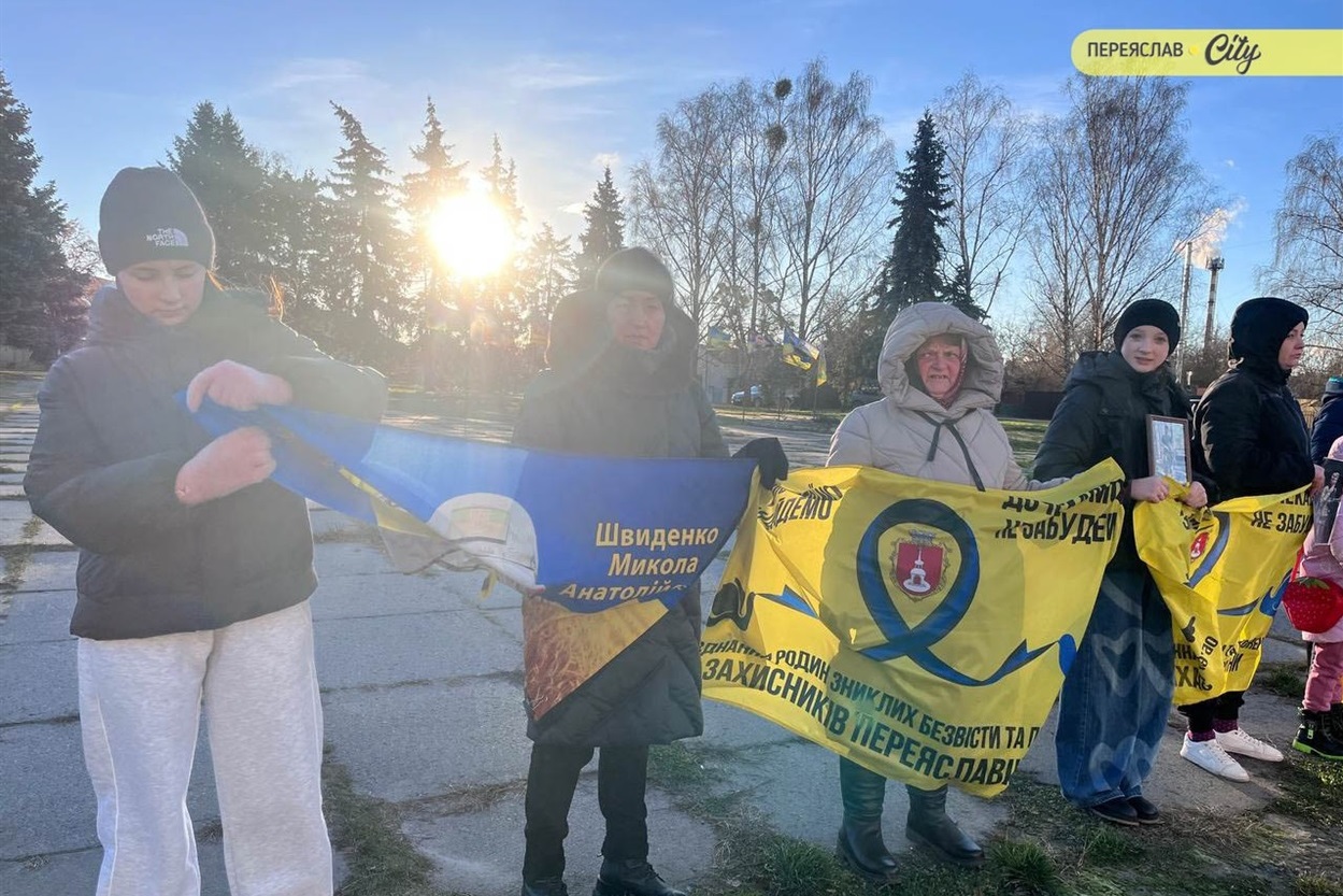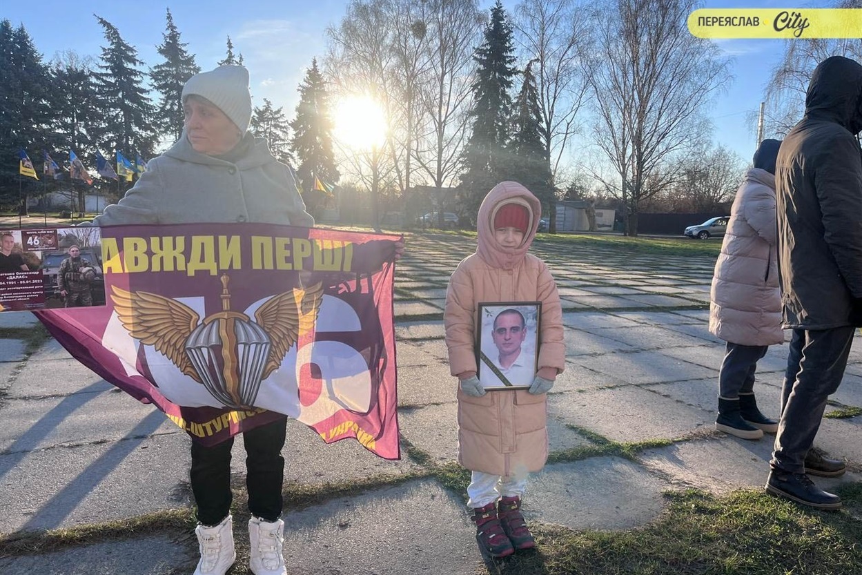 О 9:00 учасники зібралися з прапорами, плакатами й портретами своїх близьких. Поряд чергувала поліція – цього разу рух перекрили не на пішохідному переході, а безпосередньо перед родинами, які стояли на площі, повідомляє Переяслав.City.