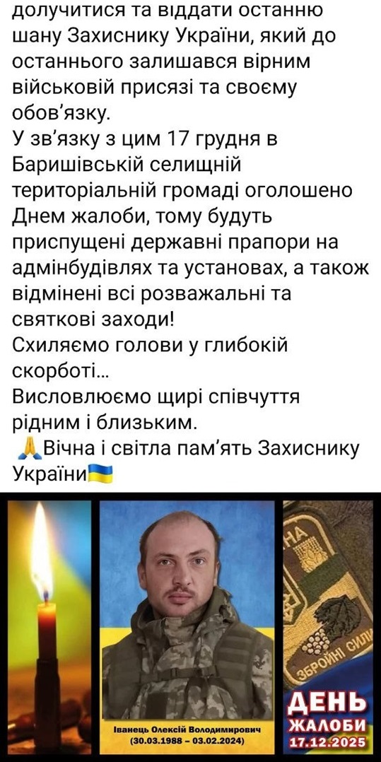 У сусідній Баришівській селищній громаді 17 грудня 2025 року оголошено День жалоби за загиблим Героєм Олексієм Іванцем. Відповідне розпорядження видала міська рада, про це публічно сповістили на сайті селищної ради та на офіційній сторінці громади в соцмережі, повідомляє Переяслав.City.