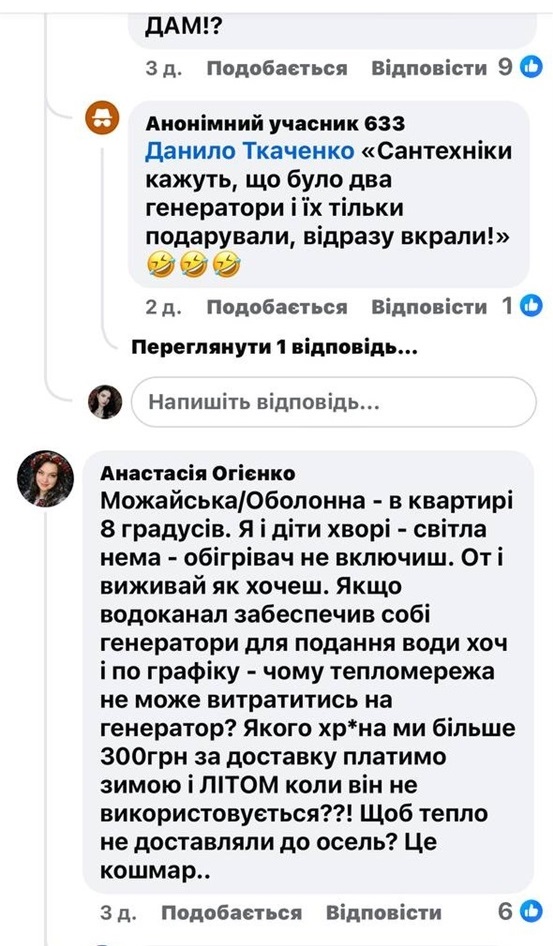 За її словами, до неї звертаються мешканці багатоквартирних будинків на вулицях Оболонна, Професійна та Богдана Хмельницького зі скаргами на припинення опалення в періоди знеструмлень. Йдеться, зокрема, про будинки за адресами: вул. Оболонна, 2б і 2в, вул. Професійна, 9 і 9а, вул. Богдана Хмельницького, 84.