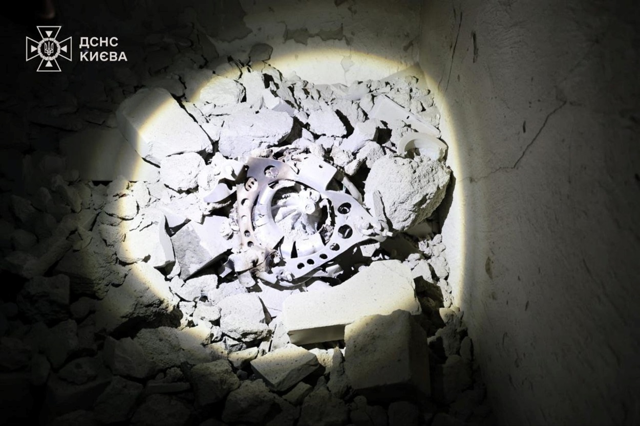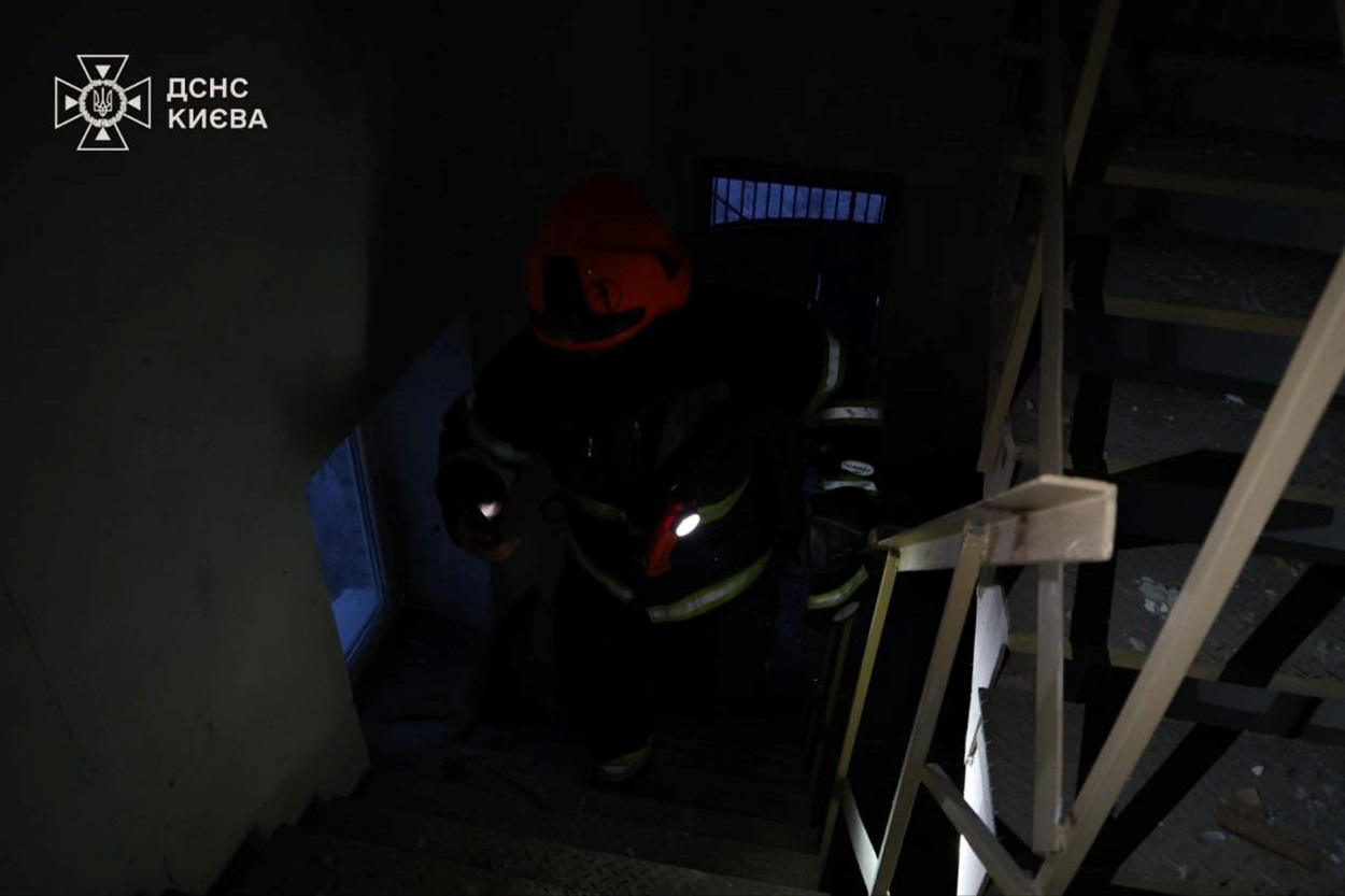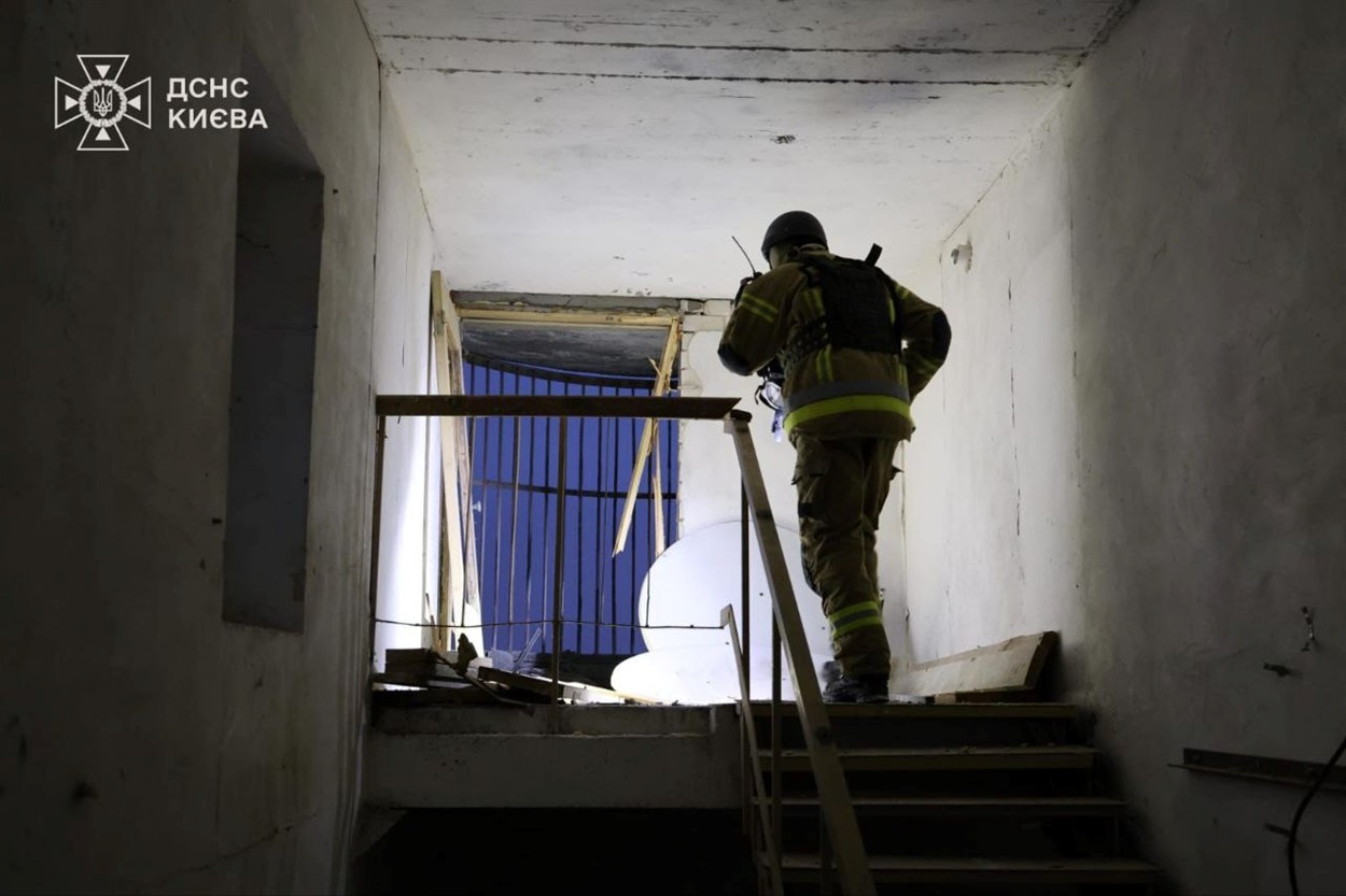 ДСНС України станом на 8:05 повідомили, що у Солом’янському районі Києва уламки БпЛА влучили у 15-поверховий житловий будинок на рівні технічного поверху. Зафіксовано руйнування стіни на площі близько 4 кв. м, пожежі не було.