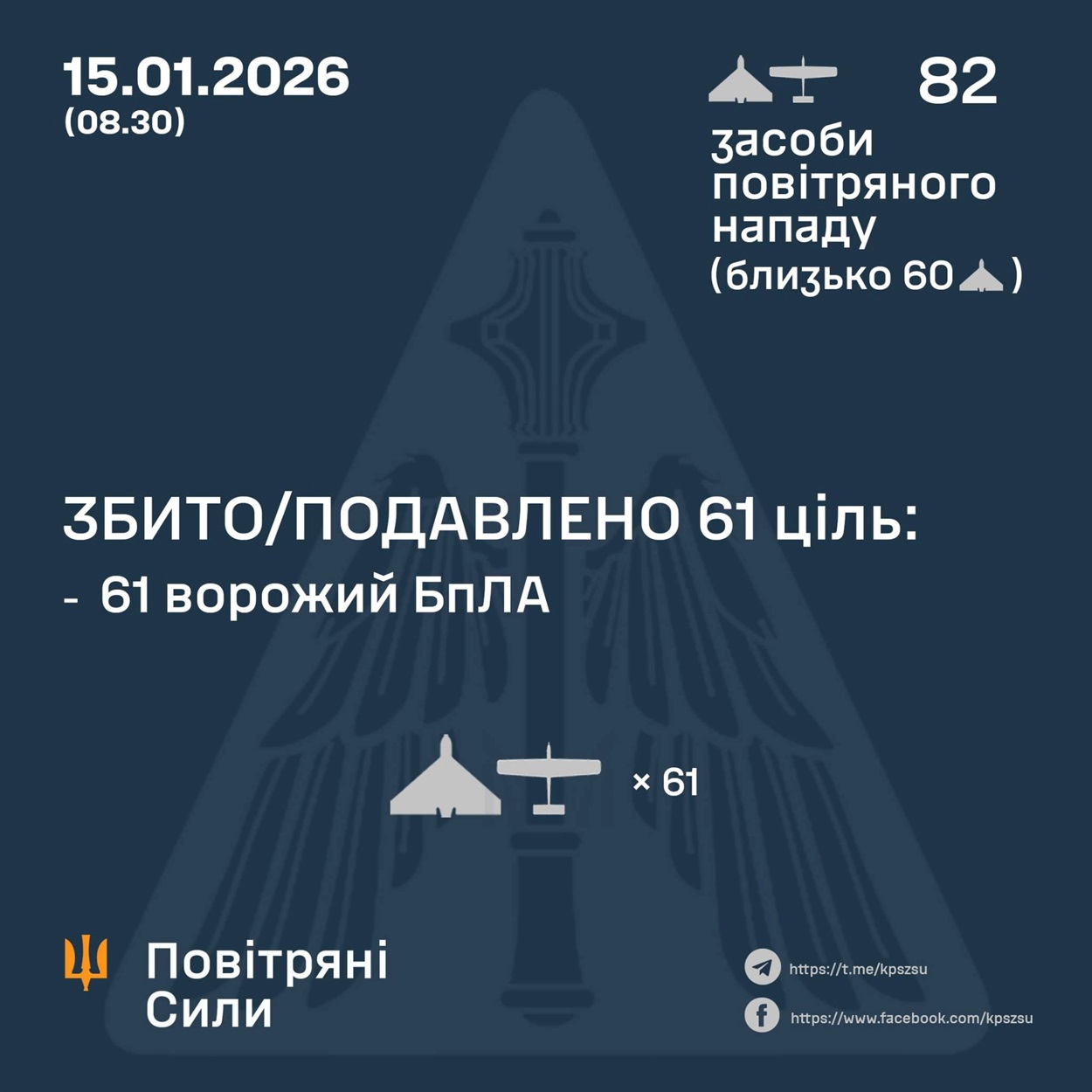 За даними Командування Повітряних Сил ЗСУ, У ніч на 15 січня (з 19:00 14 січня) противник атакував 82 ударними БпЛА типу Shahed (в т.ч. реактивними), Гербера, Італмас і безпілотниками інших типів із напрямків: Курськ, Орел, Брянськ, Приморсько-Ахтарськ, Міллерово, – рф., Гвардійське – ТОТ АР Крим, ТОТ Донецьк, близько 60 із них – "шахеди".