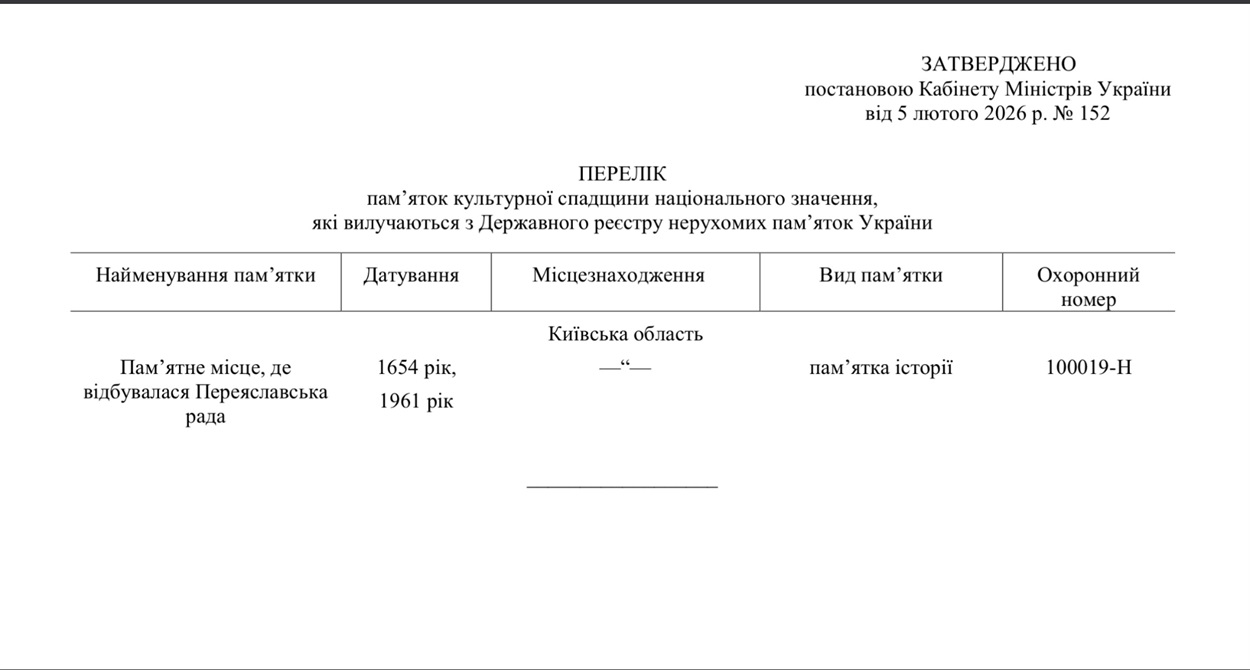 Кабінет міністрів України вилучив із Державного реєстру нерухомих пам’яток місце, де відбувалася Переяславська рада. Про це повідомляє Переяслав.City з посиланням на постанову від 5 лютого.