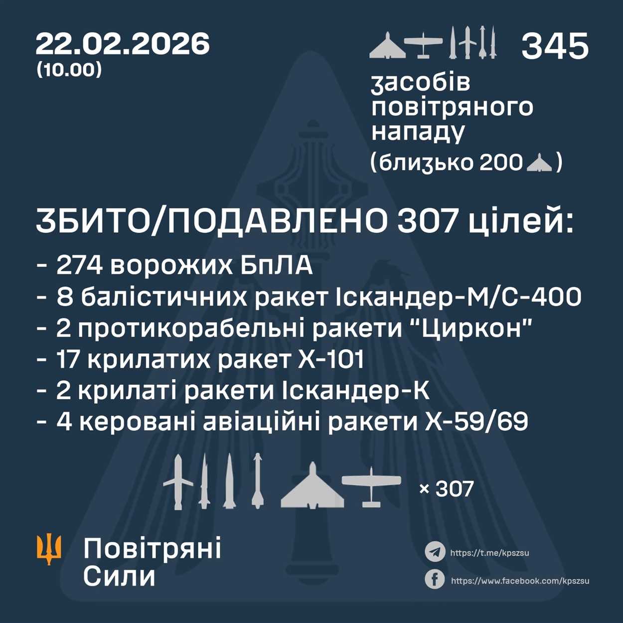 За даними Командування Повітряних Сил ЗСУ, у ніч на 22 лютого (з 19:00 21 лютого) противник завдав комбінованого удару по об'єктах критичної інфраструктури України із застосуванням ударних БпЛА, ракет повітряного та наземного. Усього радіотехнічними військами Повітряних Сил зафіксовано 345 засобів повітряного нападу: