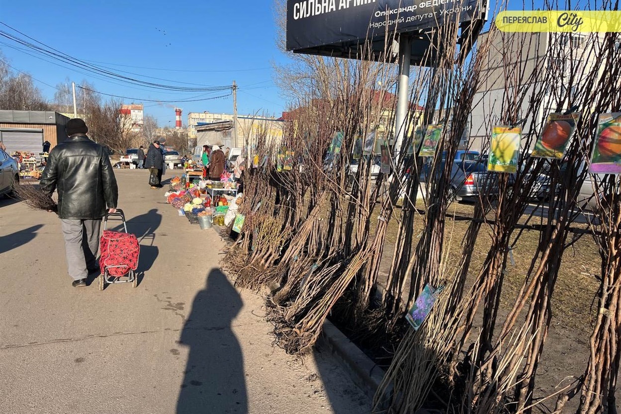 Цього тижня у Переяславі почали продавати дерева та кущі, сьогодні вони з’явилися й на базарі. Фруктові деревця коштують від 200 до 250 гривень, є дорожчі – по 300 грн, це великі вишні та сакури. Кущі смородини та агрусу – по 100-150 грн, троянди – 120 грн. Дерева купують активно, втім деякі покупці все ще боялися замерзлої землі.