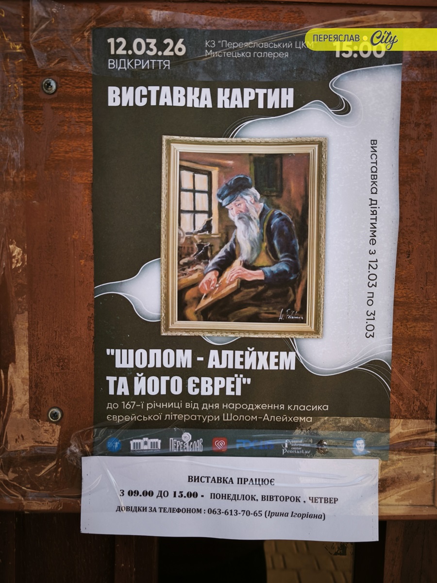 Виставку картин відкрили з нагоди 167-ї річниці від дня народження класика єврейської літератури Шолом-Алейхема (їд. שלום־עליכם, у перекладі — «мир вам»). Під таким ім'ям про нього потім дізнається весь світ. Але народився він Соломоном 2 березня 1859 року в родині переяславського дрібного крамаря Наума Рабиновича.