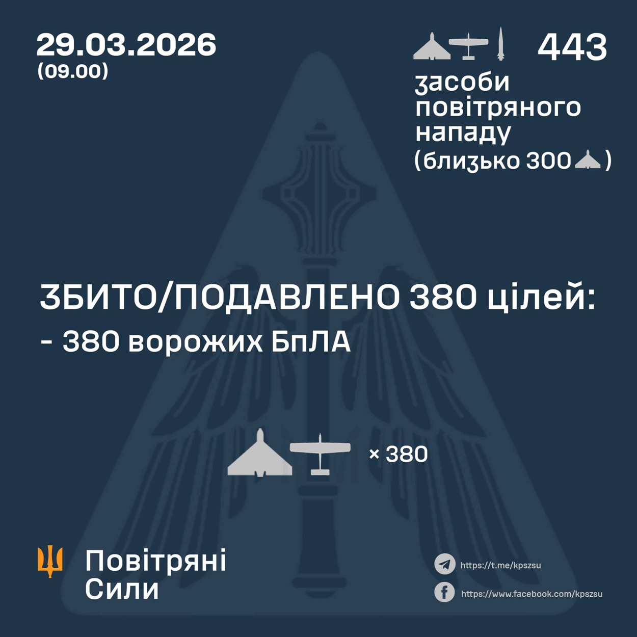 За попередніми даними, станом на 09:00, протиповітряною обороною збито/подавлено 380 ворожих БпЛА типу Shahed, Гербера, Італмас та дронів інших типів.