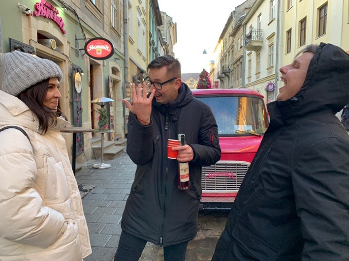 У Святвечір побачили біля ратуші автомобіль відомої української служби новин, біля нього стояли двоє дядьків. Ми почали їм махати, вони жестом запросили підійти, один з них сказав: «У нас робочий день уже закінчився, можна розслабитися» і дістав із-за пазухи пляшку дорогої горілки. «Будете?» – питає. Ну хто ж відмовляється пити із телевізійниками?