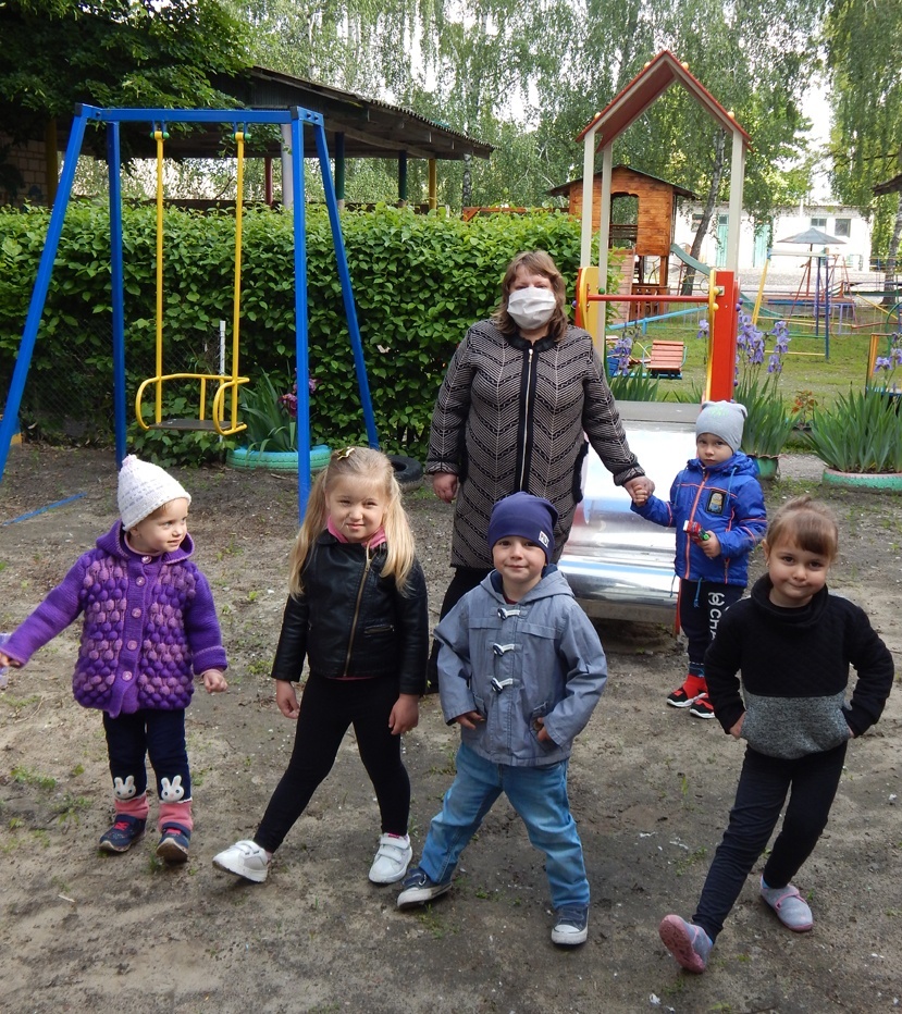 Вихователька групи "Калинка" Юлія Морфид, 40 років, зі своїми вихованцями на дитячому майданчику робить зарядку.