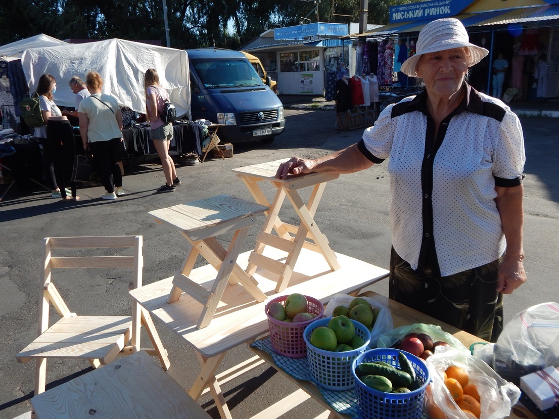 Столи по 200 грн, стільці по 100 –150 грн та овочі і фрукти зі своєї садиби продавала 76-річна Галина Литвиненко неподалік ринку "Альта".